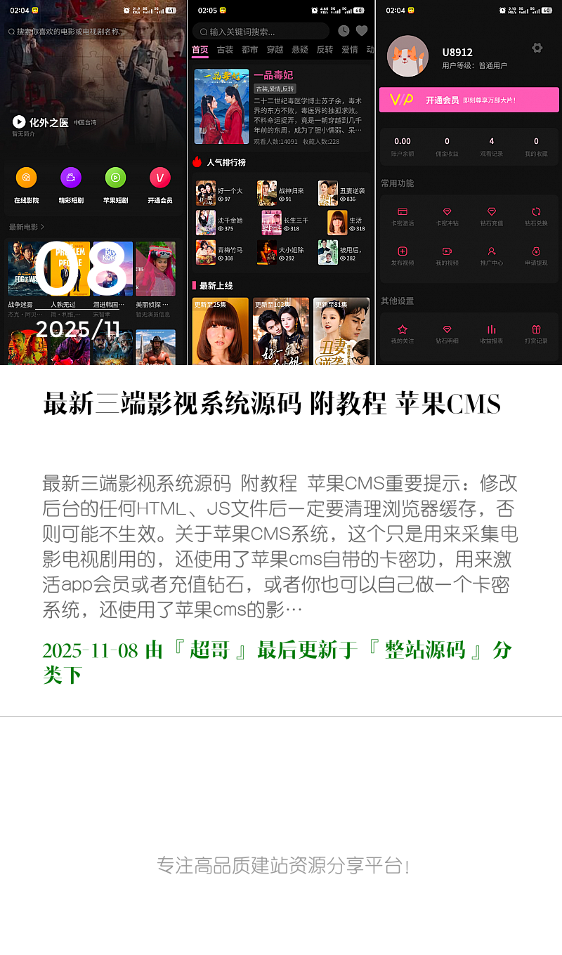 重要提示:修改后台的任何HTML、JS文件后一定要清理浏览器缓存,否则可能不生效。关于苹果CMS系统,这个只是用来采集电影电视剧用的,还使用了苹果cms自带的卡密功,用来激活app会员或者充值钻石,或者你也可以自己做一个卡密系统,还使用了苹果cms的影视分类功能,苹果cms已与app对接了,所以如非必要或者不懂,请不要改动苹果cms的任何设置,尤其是苹果cms的电影分类,切记不要去删除重新添加,请在原基础上修改即可,改动造成的错误自己解决。(做任何改动请先备份,这是良好的习惯)