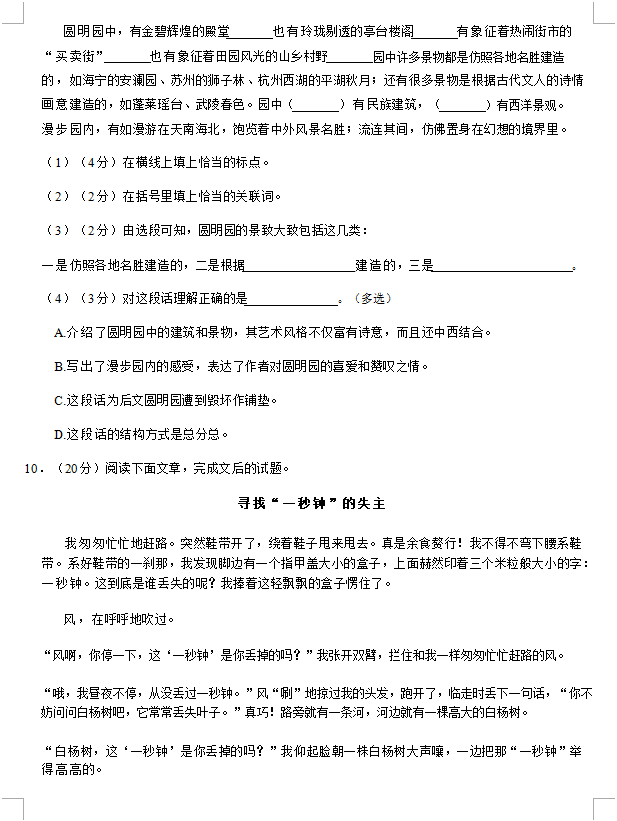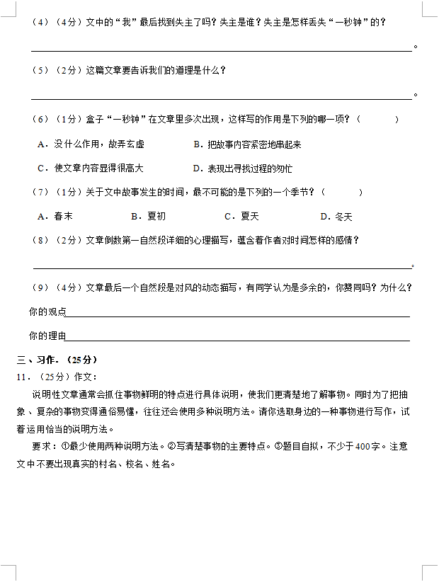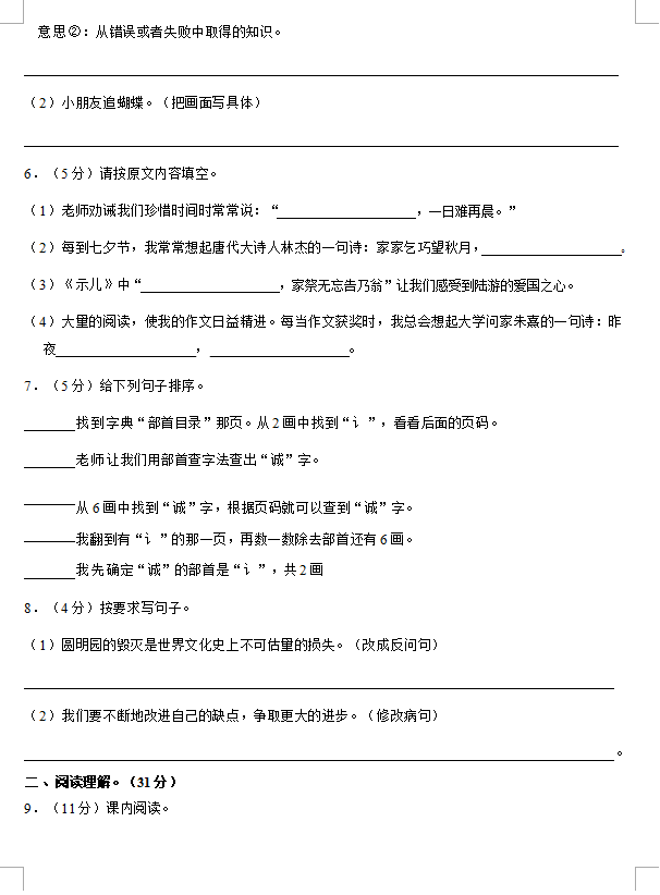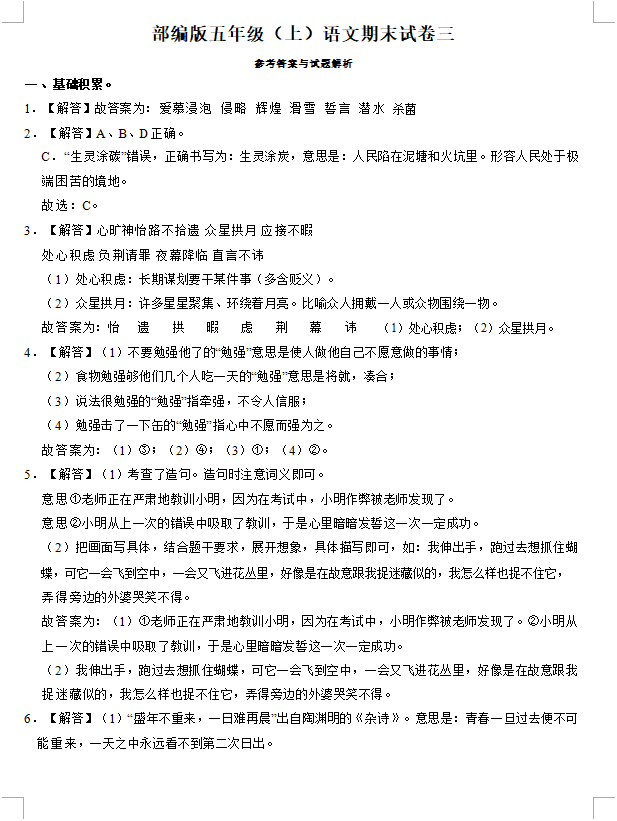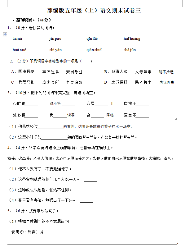 部编版五年级(上)语文期末试卷三(Word版)下载