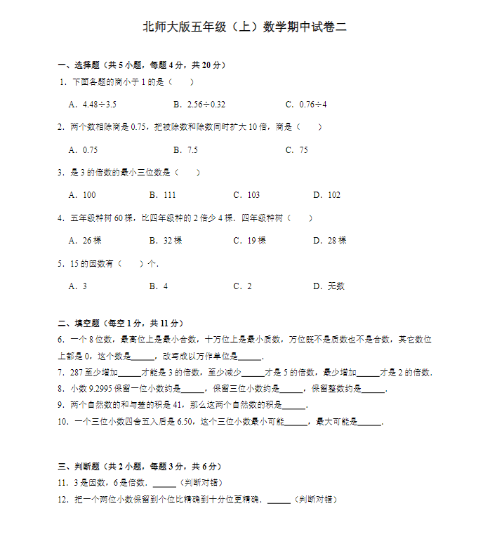果核网 五年级 北师大版五年级(上)数学期中试卷二 https://www.guohew.cn/7283.html